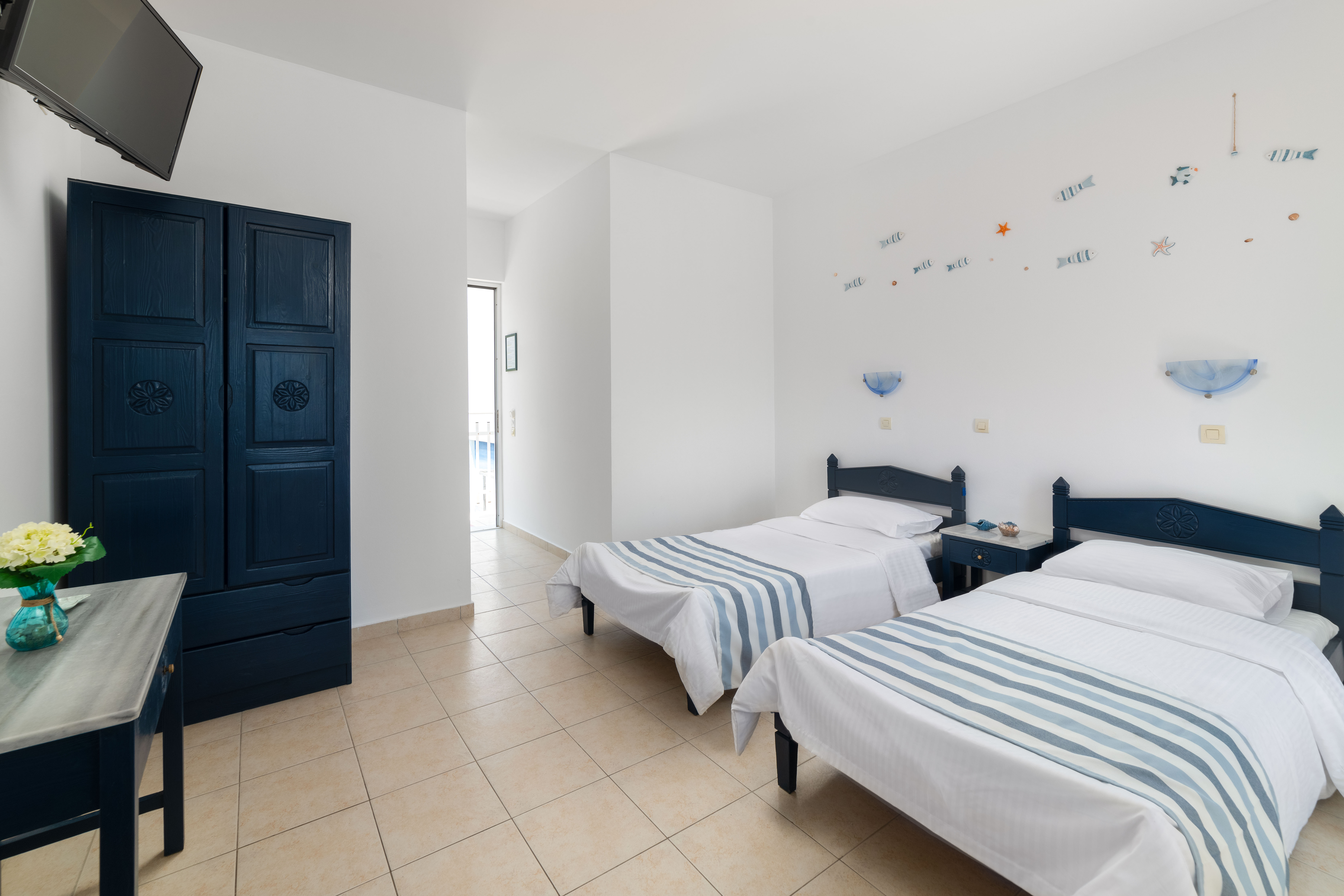 Here at Kozas Superior Apartments there are 2 apartments types available, for 3 or 4 people maximum. The 1st Floor Apartments has a balcony and Ground Floor Apartmentes has a courtyard with either a sea or mountain view.